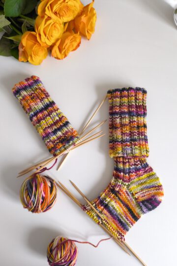 KONSTRUKTION Diese Socken werden von oben nach unten in Runden gestrickt.Sie beginnen mit einem elastischen 2×2-Rippenbündchen und werden mit einer klassischen Käppchenferse gearbeitet. Der obere Fuß wird im Rippenmuster fortgeführt, während die Unterseite glatt rechts gestrickt wird. Die Socke endet mit einer Bandchenspitze.Die Spitze wird im Maschenstich geschlossen. HINWEISE Die Socke wird im Schaft sowie […]