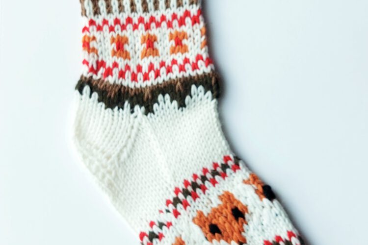 Das Bündchen wird einfarbig gearbeitet. Der Schaft zeigt ein mehrfarbiges Jacquard-Motiv. Ferse und Zwickel werden in der Grundfarbe gestrickt.