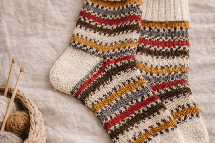 Diese Socken werden von oben nach unten in Runden gestrickt.