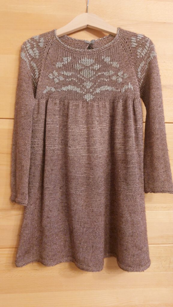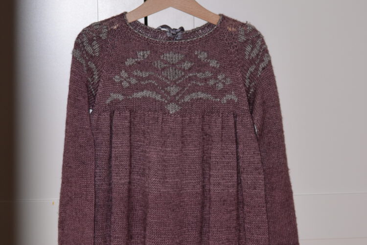 Seidenkleid Norweger Art Erstellt von admin am Februar 17, 2026 in Blog Strickkleid aus Yak-Seiden Garne mit Schleifen.