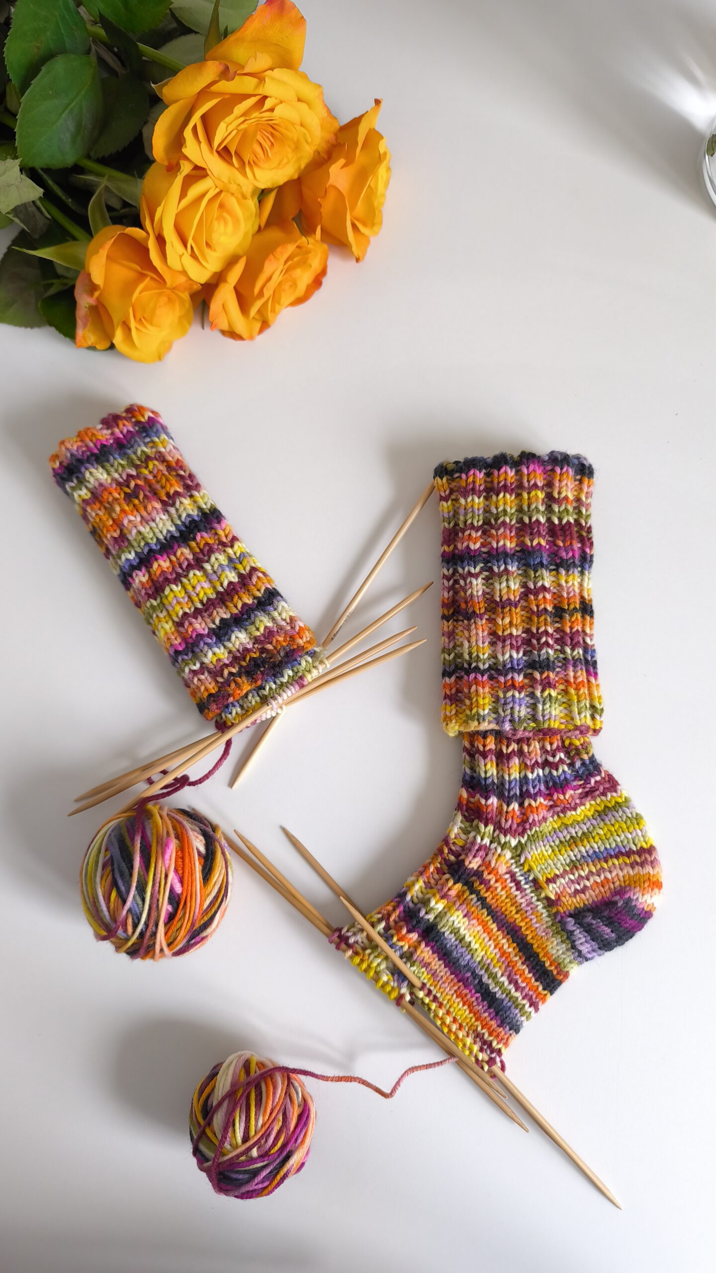 Sie beginnen mit einem elastischen 2×2-Rippenbündchen und werden mit einer klassischen Käppchenferse gearbeitet. Der obere Fuß wird im Rippenmuster fortgeführt, während die Unterseite glatt rechts gestrickt wird. Die Socke endet mit einer Bandchenspitze.